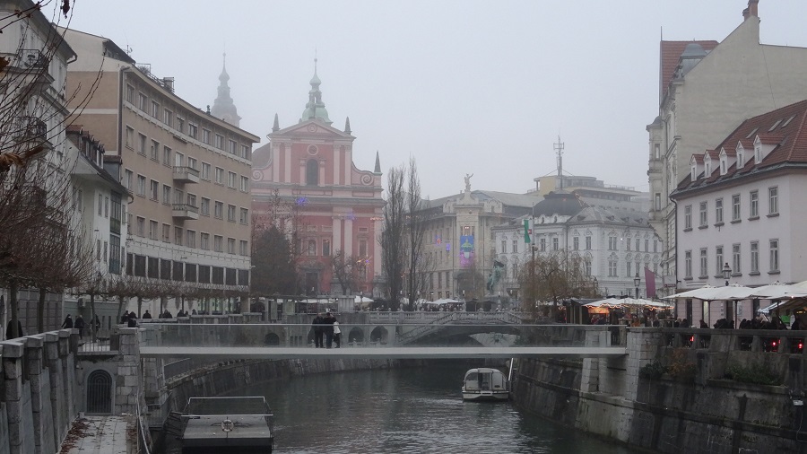Les sites météo nous avaient annoncé des éclaircies et du soleil mais le brouillard semble bien installé sur la ville. Nous déjeunons de bonne heure et partons pour le centre-ville afin de visiter de jour la capitale SLOVENE. Premier arrêt, le parc TIVOLI où nous profitons d’une grande exposition photo en plein air, l’occasion de voir LJUBLJANA sous le soleil et sous la neige (nous avons la version sous le brouillard). Nous repartons ensuite pour le cœur de ville toujours aussi animé et déambulons dans les rues aux grés des petites ruelles, venelles et petits ponts qui parsèment la vieille ville.