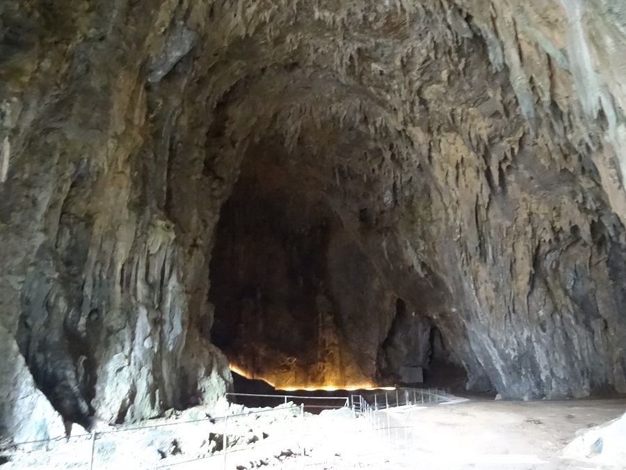 La nuit a été très calme et nous nous réveillons en forme pour débuter l’école dès 8h00. Ce vendredi matin nous visitons les grottes de Škocjan inscrites depuis 1986 au patrimoine mondial de l’UNESCO, il s’agit de la plus grande zone humide souterraine d’Europe. La visite sera en anglais, cela tombe bien car c’était le jour de cours d’anglais pour Antoine. Nous sommes 5 pour la visite, un intrus s’est glissé dans la famille mais restera affable durant toute la visite. Notre guide n’est guère plus bavarde que notre compagnon de visite mais cela a le mérite de nous permettre de profiter pleinement de l’atmosphère presque irréelle que nous offre le gouffre. La première partie se passe dans un silence impressionnant avec une salle atteignant les 40 mètres de haut et des stalactites et stalagmites (qui non plus de secret pour Antoine et Anna) de plus de 15 mètres. Quant à la seconde partie, nous sommes plongés dans « voyage au centre de la terre » avec une salle de plus 100m de haut où coule la tumultueuse rivière Rika en son fond. Depuis le début de la salle, nous pouvons voir le cheminement que nous allons emprunter, balisé par de faibles éclairages, qui nous mènera plus d’un 1.5km plus loin à la sortie de la cavité. Le gigantisme de la grotte nous donne le vertige avec en fond sonore le grondement de la rivière.