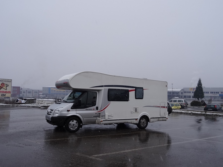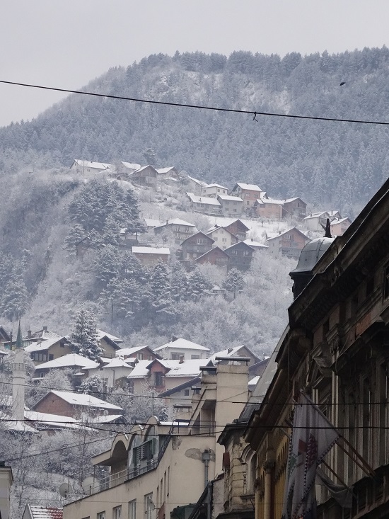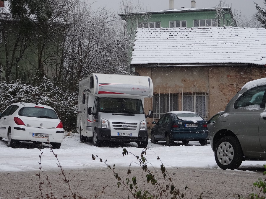 Le brouillard s’est légèrement levé et le paysage devient plus accueillant, nous reprenons la route en direction de SARAJEVO. La signalétique est difficile à suivre car la plupart des panneaux sont tagués et toutes les mentions en Cyrilliques sont : ou totalement effacées ou passées à la bombe noire. Ce n’est pas que nous ayons appris l’alphabet Russe entre temps, mais le mot « cyrillique » me plait bien !!! Revenons à nos moutons : notre GPS continue sa grève de la Bosnie et refuse définitivement de répondre présent. Nous arrivons donc dans la capitale sans adresse pour nous poser et sous une tempête de neige. La noirceur des abords de la ville contraste avec le blanc de la neige. La ville est enchâssée dans une vallée étroite, la vieille ville se trouvant dans le cirque finale de la vallée. Les rues sont étroites et les parkings quasi inexistants ou non appropriés pour garer notre Char. Après 1 heure de recherches et deux tours complets de la ville, nous décidons de partir à flanc de montagne et trouvons un petit parking en terre recouvert de neige nous permettant de nous garer. C’est le soulagement. Après avoir acquitté le montant au gardien pour les 4 prochaines heures, nous couvrons les enfants, sortons les bottes de neiges et partons à la découverte de la ville.