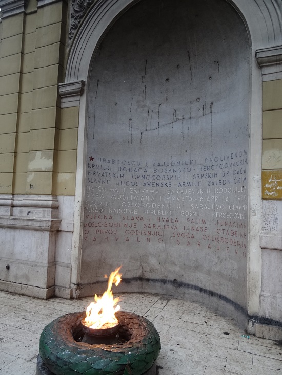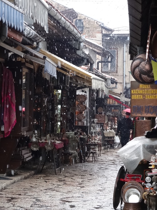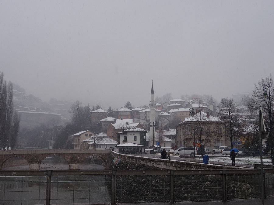 La neige tombe maintenant à gros flocons et après un passage dans la ville nouvelle, nous partons dénicher un restaurant local dans le vieux Sarajevo pour déguster les spécialités Bosniaques. La vieille ville nous rappelle les souks marocains et en levant la tête nous constatons que nous sommes cernés par les minarets des mosquées. C’est la sortie de la prière et tous les hommes se rechaussent pour sortir dans la rue. Notre restaurant est baigné dans une ambiance turc avec en fond sonore une musique locale. Nos voisins de table arrivent et s’installent pour déjeuner sans enlever leurs manteaux ni leurs bonnets, les bosniaques ne semblent pas être bavards en famille et finissent de déjeuner en moins de temps qu’il ne faut pour le dire. De notre côté, nous profitons de ce moment au chaud et apprécions les énormes plats appétissants qui nous ont été servis. Pendant le repas, nous entendons l’appel du Muezzin pour la prière Islamique, un dépaysement total, d’autant plus que nous ne nous attendions pas à trouver une représentation islamique aussi présente dans le pays. Dans cette ville nous trouvons également nombres d’églises Catholiques, Orthodoxes et de Synagogues, montrant s’il en était besoin la pluriethnicité de cette capitale.