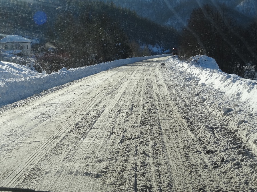 Le thermomètre affiche -4°C, nous décollons à 8h10 et après 5 kilomètres à peu près dégagés nous attaquons l’ascension d’un col de plus de 1200 m qui n’a pas dû voir le passage du chasse neige depuis quelques jours, il y a entre 10 et 15 cm de neige sur la route qui se transforme en mélasse rendant la conduite de notre Bouba des plus acrobatiques. C’est parti pour 1h30 de route dans des conditions plutôt moyennes avec à la clef, un deuxième col de « première catégorie » sur les routes secondaires macédoniennes.
