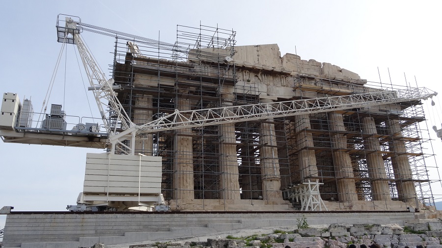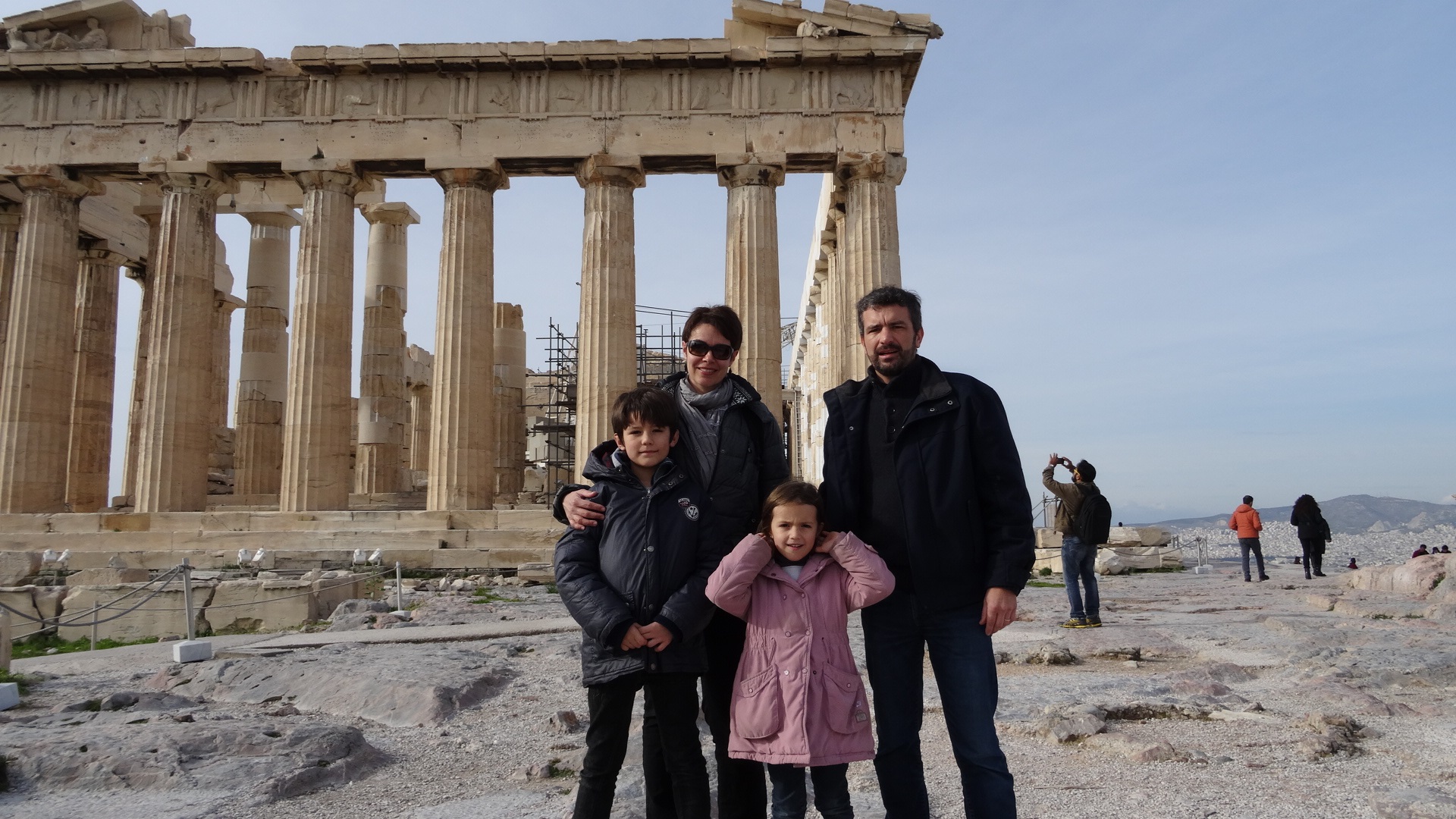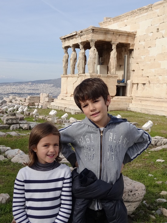 Réveil samedi matin (un petit peu mal aux cheveux), nous passons saluer « la famille de français » puisqu’ils quittent eux aussi le camping aujourd’hui, puis départ pour découvrir le site de l’Acropole. Pas besoin de faire la queue, c’est pas la foule des grands jours, le soleil commence à percer et le site est évidemment très beau. Malheureusement, beaucoup d’échafaudages viennent gâcher Le Parthénon puisque de grands travaux sont en cours pour tenter de redonner au temple son allure d’antan. Malgré tout, nous profitons pleinement du site, des temples de l’Erechthéion et d’Athéna, et puis c’est l’occasion de revoir toute la mythologie grecque qui a été étudiée il y a déjà bien longtemps….