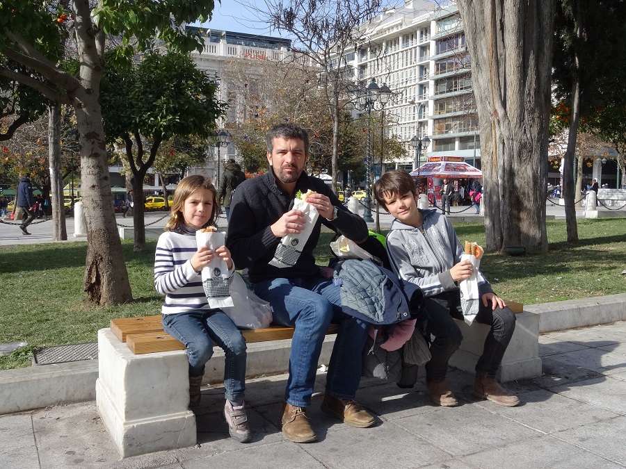 Après cette belle visite et cette belle promenade avec ces nombreuses marches, décidément nos mollets ne sont pas épargnés durant notre voyage, nous allons casser la croute sur la place centrale d’Athènes, pause sandwiches et clémentines très appréciée pour nous 4 avec en prime un soleil radieux.