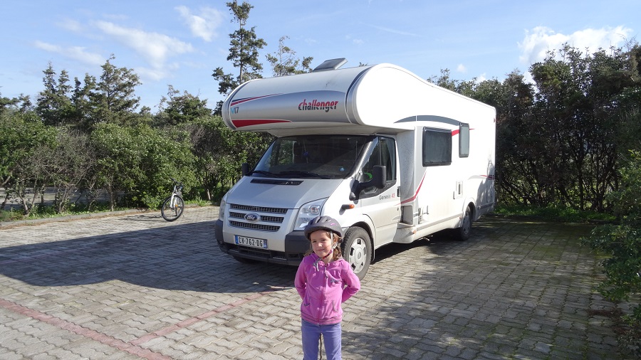 Ce lundi matin le mercure nous gratifie d’un 15°c dès le réveil et le ciel bleu nous promet encore une belle journée. Le parking sur lequel nous nous sommes installés est vaste et permet aux enfants de faire un tour en vélo durant la récréation de l’école.