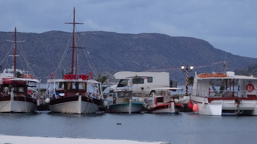 Nous nous stationnons face au vent afin de limiter le roulis pour le camion mais la nuit ne s’annonce pas des plus calmes. Demain départ pour le port d’Agios Nikolaos, pour une journée logistique et courses…