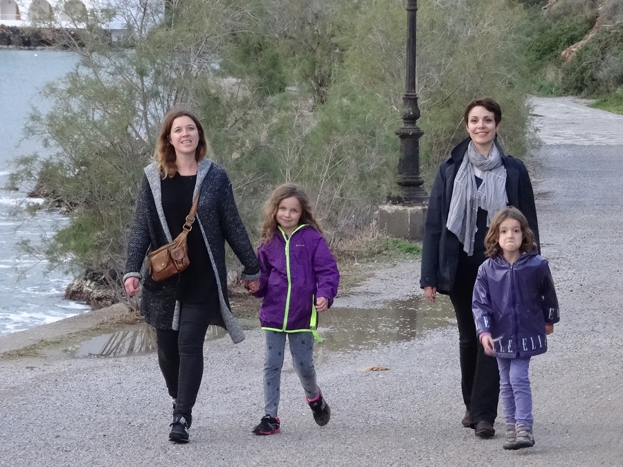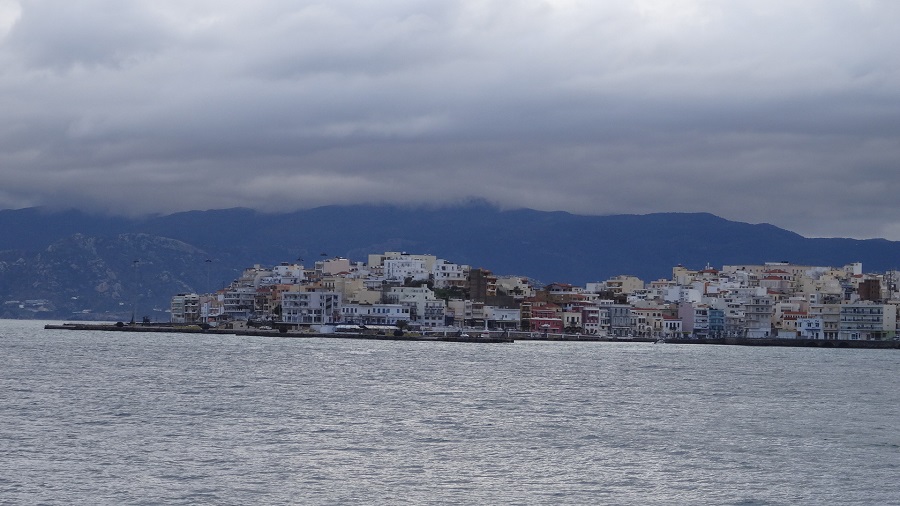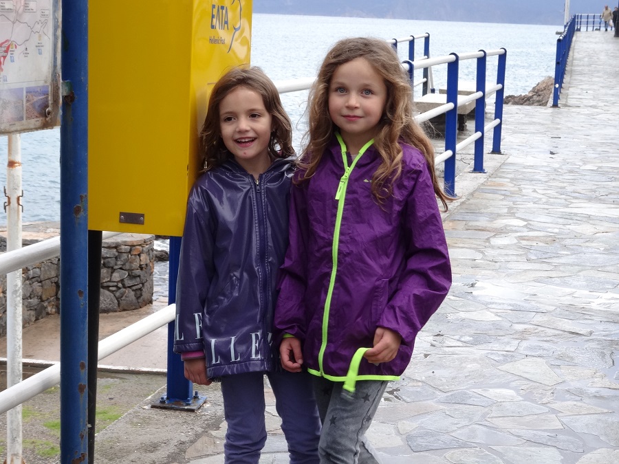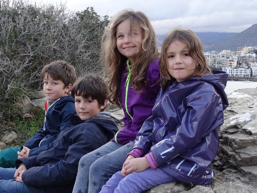 La nuit a été bien arrosée et le réveil se fait dans la grisaille, deuxième jour de mauvais temps, espérons que le temps se lève… Après la classe, nous invitons nos voisins à partager un café, l’occasion pour les enfants de jouer avec leurs nouveaux copains et pour nous de parler avec des adultes et de se resocialiser après ces 4.5 mois passer quasi qu’entre nous !!! Des affinités se créent et nous décidons de nous balader tous ensemble après déjeuner pour découvrir la ville d’Ágios Nikólaos, sa baie et ses falaises.