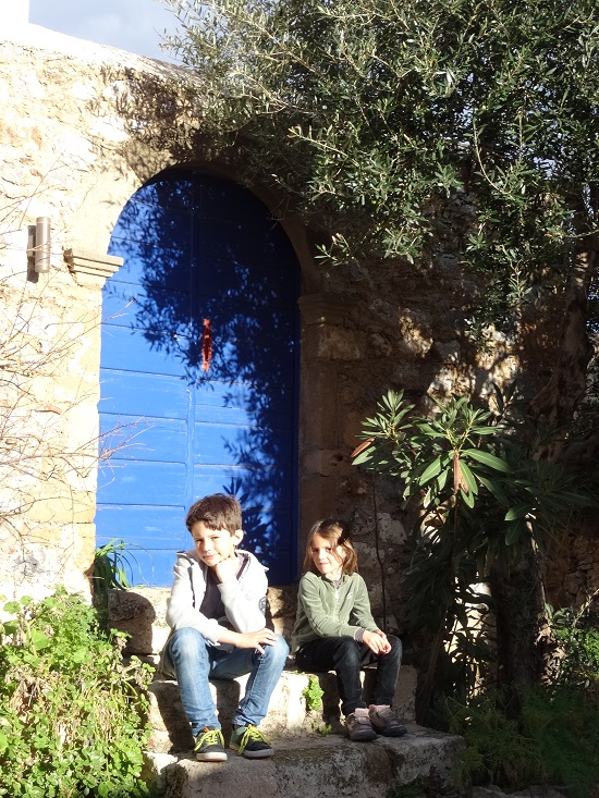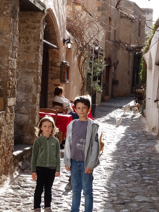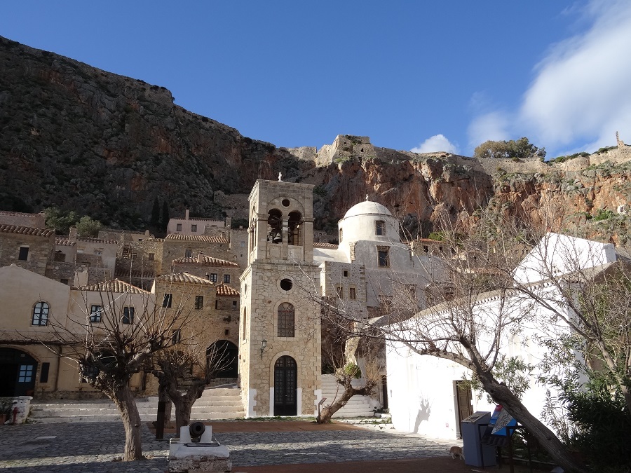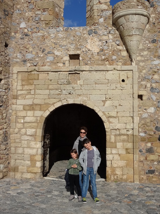 Monemvassia est une vraie curiosité puisque la ville est divisée en deux parties, la ville moderne « Géfira » et en face, séparée par une digue la ville médiévale, véritable forteresse « Kastro ». Nous pénétrons dans la petite cité après un bon kilomètre de marche, l’entrée se fait par une porte unique, en chicane et voutée, tient une chicane ça nous rappelle quelque chose !!!