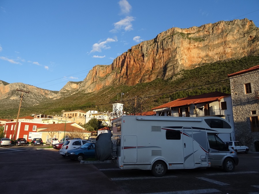 Nous empruntons la route côtière qui longe le golf Argolique, la route est superbe mais très sinueuse (heureusement, depuis 5 mois aucun passager n’est atteint du mal de la route). Un peu avant le coucher du soleil, nous nous arrêtons dans le bourg de Leonidio pour y passer la nuit, ainsi, demain 2 heures suffiront à rejoindre notre destination.
