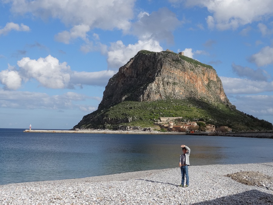 Encore 1 H de route avec en tête notre épopée et les jambes en coton, nous arrivons enfin à Monemvassia. Nous ne tentons même pas de rentrer dans le village et stationnons Bouba le long de la plage pour partir à l’assaut, à pieds, du village médiéval.
