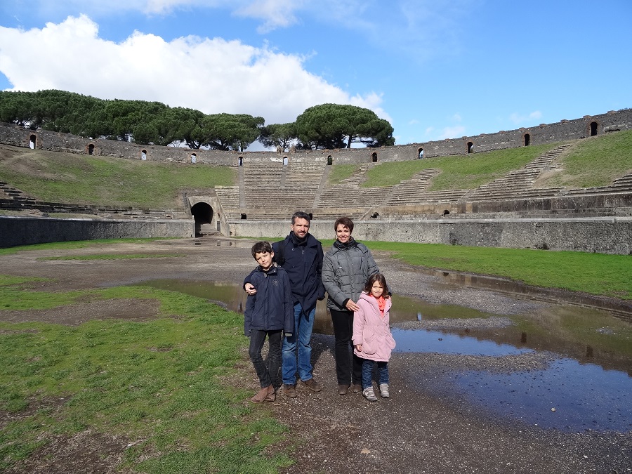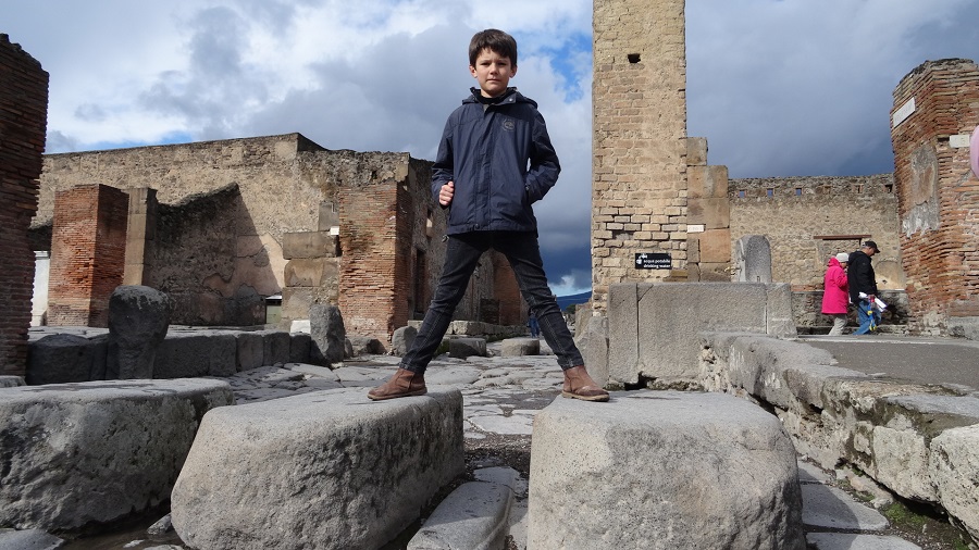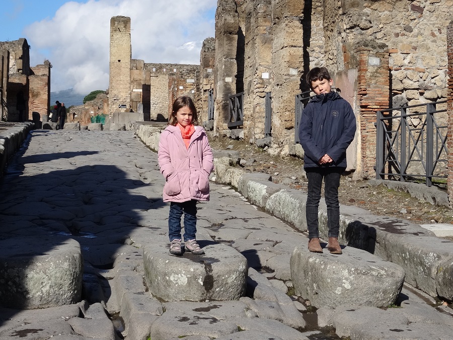 Réveil sous un ciel orageux dans le camping de Pompéi, effectivement, un bel orage se prépare et le tonnerre gronde au-dessus de nos têtes. Nous avons récupéré une heure de sommeil par rapport à la Grèce et sommes à nouveau sur le fuseau horaire de la France. Nous sommes donc en forme ce matin et n’avons pas subit la sonnerie du réveil. Après l’école, le ciel se dégage et nous en profitons pour filer sur le site archéologique de Pompéi qui se trouve juste en face du camping.