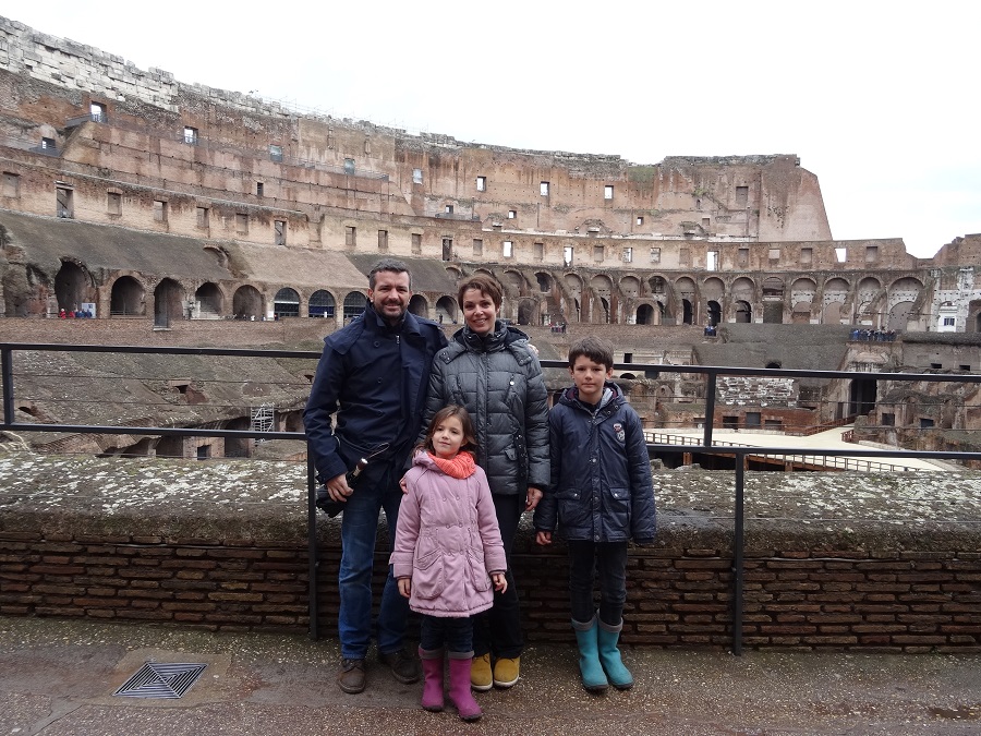 Coucou les vagabonds ! que de beaux souvenirs mais dommage pour la météo face à de tels vestiges. En revanche bel photo de famille à l’intérieur du Colisée, mais aussi de cet ange gardien qui vous a protégé pendant ce long périple. Vous venez de vivre et de me faire vivre une belle aventure que je ne suis pas prête d’oublier. Bises à tous les 4 et bonne route pour la suite du parcours.