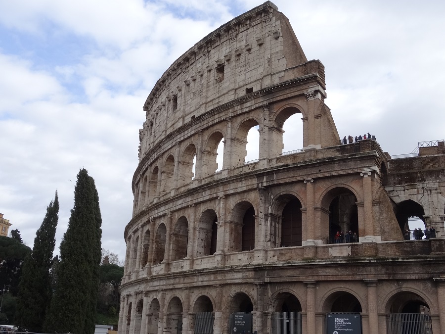 De toute façon, cette matinée nous avons programmé la visite du Colisée et il est impassable de partir de Rome sans être passé voir un édifice aussi monumental que celui-ci faisant partie des 7 merveilles du monde. Nous nous équipons donc pour la pluie et embarquons nos parapluies afin de gagner le bus 50 pour le centre-ville, un petit coup de la ligne B du métro (ce n’est pas compliqué il n’y a que deux lignes à Rome – pour une ville grande comme Paris !!!) et nous voilà aux pieds de ce monstre de calcaire. Les dimensions sont impressionnantes 187m de long, 155m de large et 50m de hauteur pouvant accueillir jusqu’à 70 000 spectateurs… Je ne sais pas si le ciel a vu nos préparatifs anti-pluie mais une chose est sûre, c’est que le soleil bataille dur pour se frayer un passage, le temps de faire la queue pour prendre les billets pour le Colisée et les premiers rayons de soleil pointent le bout de leur nez. La partie intérieure est moins esthétique que les harmonieuses arches visibles de l’extérieur mais les détériorations du site subis depuis 20 siècles ont le mérite de nous permettre de visualiser le squelette massif de ce monstre d’architecture et de mieux comprendre comment il a pu traverser le temps en gardant toujours sa splendeur et son aura. Le Colisée a été le plus grand amphithéâtre construit de tous les temps. Outre les combats de gladiateurs, de nombreux autres spectacles y ont été organisés, tels que des chasses d’animaux sauvages (pour l’inauguration plus de 9000 animaux sauvages ont été tués), des exécutions publiques, des reconstitutions de batailles célèbres et du théâtre dramatique. Pour les combats de gladiateurs, vous pouvez rayer cela de vos projets car l’âge maxi des combattants dépassait rarement les 22 ans…