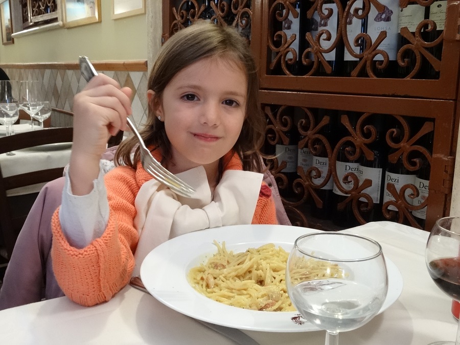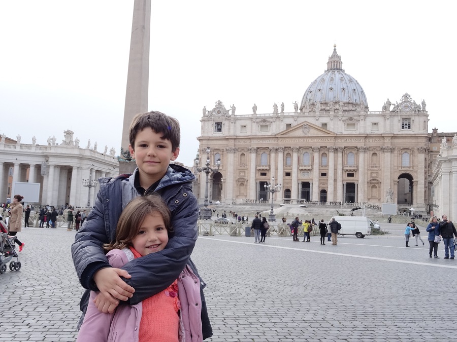 Nous quittons ensuite le Colisée pour filer vers la place Saint Pierre au Vatican que nous n’avions pas eu le temps de voir hier. Nous nous arrêtons pour nous faire un petit restaurant situé à l’écart dans une petite ruelle et en profitons pour nous faire plaisir avec de la bonne cuisine italienne. Après de bons desserts et l’estomac bien rempli nous partons vers la place Papale que nous trouvons telle que nous nous l’imaginions avec les vendeurs en tous genres en moins. Nous sommes interpelés tous les mètres pour nous vendre divers gadgets, nous imaginons difficilement ce que cela doit être en pleine période touristique.