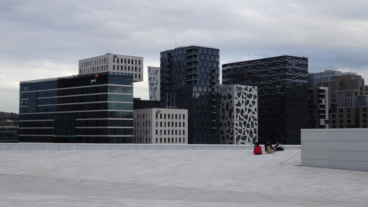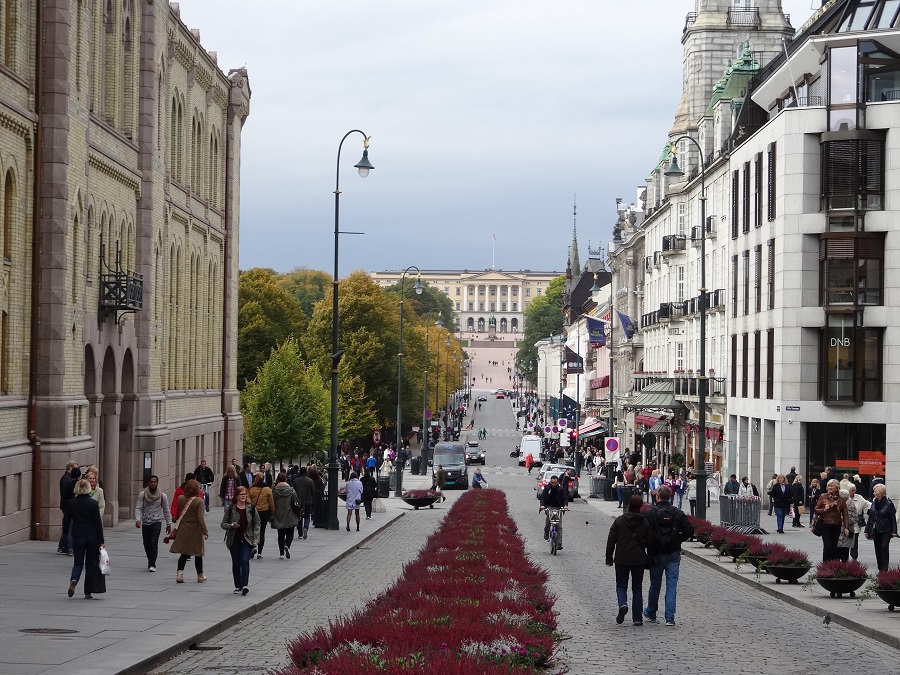 Direction le fameux parking, mais à notre arrivée, grosse déception, il se trouve juste au bord de la 2 x 2 voies, les places sont toutes petites (pas pratique), on devient difficile !! Demi-tour et direction un autre parking à côté d’un musée dans la banlieue chic d’Oslo, spot qui nous avait été indiqué par la famille Mullot croisée en Allemagne. Merci du conseil les amis, on s’installe donc pour la journée et la nuit, de plus un bus nous emmène directement en centre-ville. Après 20 mn de bus, nous voilà donc dans la capitale Norvégienne et là petite déception, c’est sûr qu’après la majestueuse capitale Suédoise, OSLO fait pâle figure (je vous ai dit qu’on devient difficile). La capitale nous présente un ensemble de bâtiments hétéroclites à l’architecture parfois assez lourde (de type allemande), la ville n’est pas très propre mais quelques bâtiments sortent quand même du lot notamment l’opéra –duquel nous montons sur le toit pour profiter d’une belle vue sur OSLO. Durant toute la journée nous parcourons OSLO et visitons la galerie nationale (musée d’art) ou nous pouvons admirer entre autres, des Picasso, Matisse, mais surtout des Munch (dont son célèbre Scream) peintre Norvégien, fierté du pays. Après la galerie, notre chemin nous emmène vers le Palais Royale (mais comme le roi et la reine n’y sont pas…) puis vers la rue commerçante et le Parlement Norvegien.