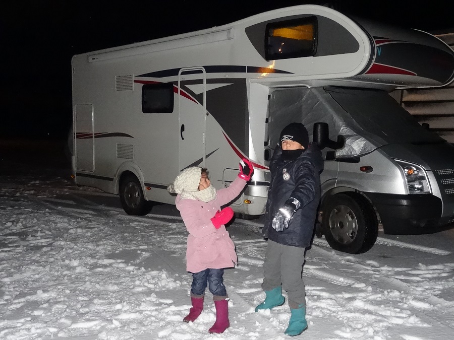 Après le déjeuner, nous partons vers 13h30 à la découverte du grand NORD et là, notre fameuse route Européenne E6 se transforme en une véritable piste de bobsleigh, le chasse neige n’est pas passé et la sableuse n’a pas dû se réveiller non plus. La route que nous pensions avaler en 3h30 se transforme peu à peu en parcours du combattant avec tornade de neige, vent et la nuit qui tombe à 16h30, un vrai bonheur ; nous décidons de faire un break à 40 km de notre but sur une aire qui n’en est plus une, car tout est fermé et sous la neige. Les enfants sont heureux, eux qui rêvaient de la neige, ils sont servis et attaque dès leur sortie la réalisation d’un bonhomme de neige. Un autre camping-car allemand a également trouvé refuge à coté de nous. Le beau temps est annoncé pour demain matin mais le temps change très vite sous ces latitudes. Nous nous couchons en bénissant notre fournisseur de pneus norvégien.