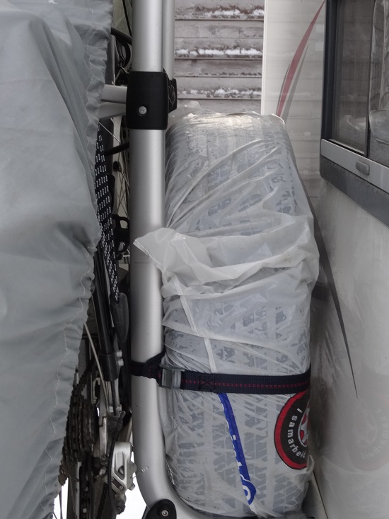 Nous arrivons à caler un des pneus « été » derrière le support de vélo et finissons par trouver une place pour le deuxième pneu dans la soute (pour les fondus de Joséphine Ange Gardien, nous avons un peu l’impression d’avoir son fameux sac à main continuellement extensible à la place de notre soute – chacun ses références)