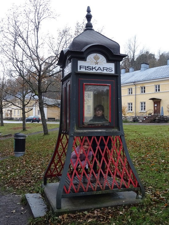 Ce lundi, c’est réveil au camping, après l’école et les pleins faits, nous traversons la ville d’HELSINKI pour filer vers le petit Village de FISKARS. Cette petite bourgade est historiquement la plus ancienne industrie Finlandaise puisqu’elle débuta dès 1649 avec la manufacture de paires de ciseaux. Après vérification dans les tiroirs du camion, il s’avère que nous sommes également équipés des fameux ciseaux FISKARS dont le plus connu est la paire de ciseaux « orange » pour la papeterie. (Jetez un coup d’œil sur les lames de vos paires de ciseaux vous serez sûrement surpris !!). Le village est plutôt sympathique avec l’ancienne fabrique et la monumentale demeure des FISKARS qui reste encore actuellement le siège de la compagnie. L’entreprise historique continue encore à prospérer avec une gamme élargie en outillage de jardinage et en art de la table.