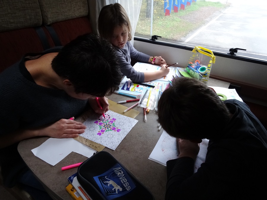 Dimanche 9 novembre, nous nous réveillons en forme après une grosse nuit de sommeil (il est vrai que la circulation dans ce coin précis du pays n’est pas spécialement dense en cette période), en ouvrant les rideaux nous notons que la brume est déjà au rendez-vous, nous descendons quand même les vélos de l’arrière du camion espérant faire venir le soleil. Après 2H30 de coloriage (Mandala pour Stéphanie et Antoine et Abricot pour Anna), nous nous rendons à l’évidence que la sortie en vélo ne sera pas pour aujourd’hui. Après avoir rechargé notre paquetage, nous filons vers le village voisin pour prendre le déjeuner et décidons de regagner le continent pour tenter notre chance dans un autre camping « permanent » de l’autre côté de l’isthme.